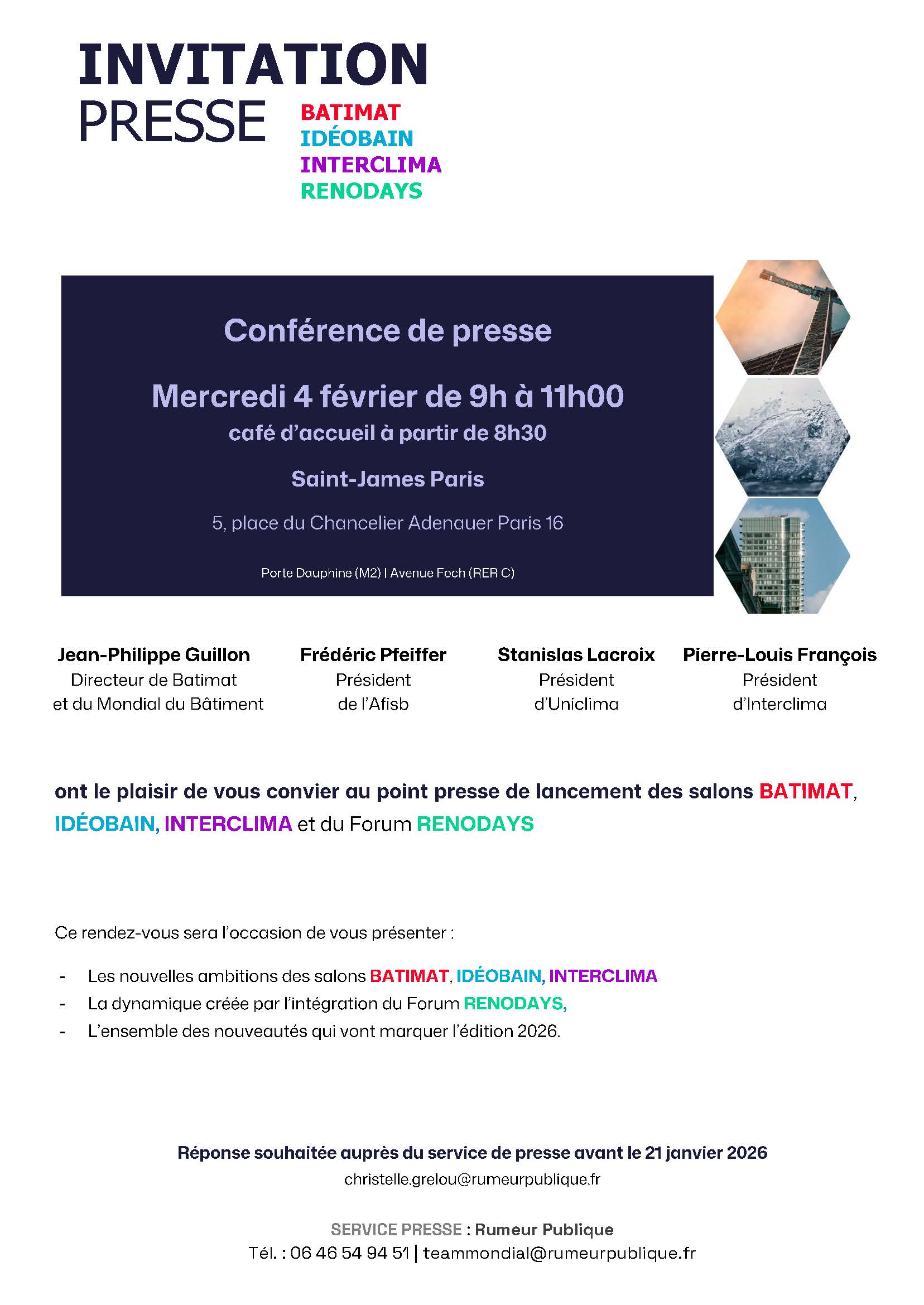 Conférence de presse de lancement de l'édition 2026 des salons Batimat, Idéobain, Interclima et du Forum Renodays
